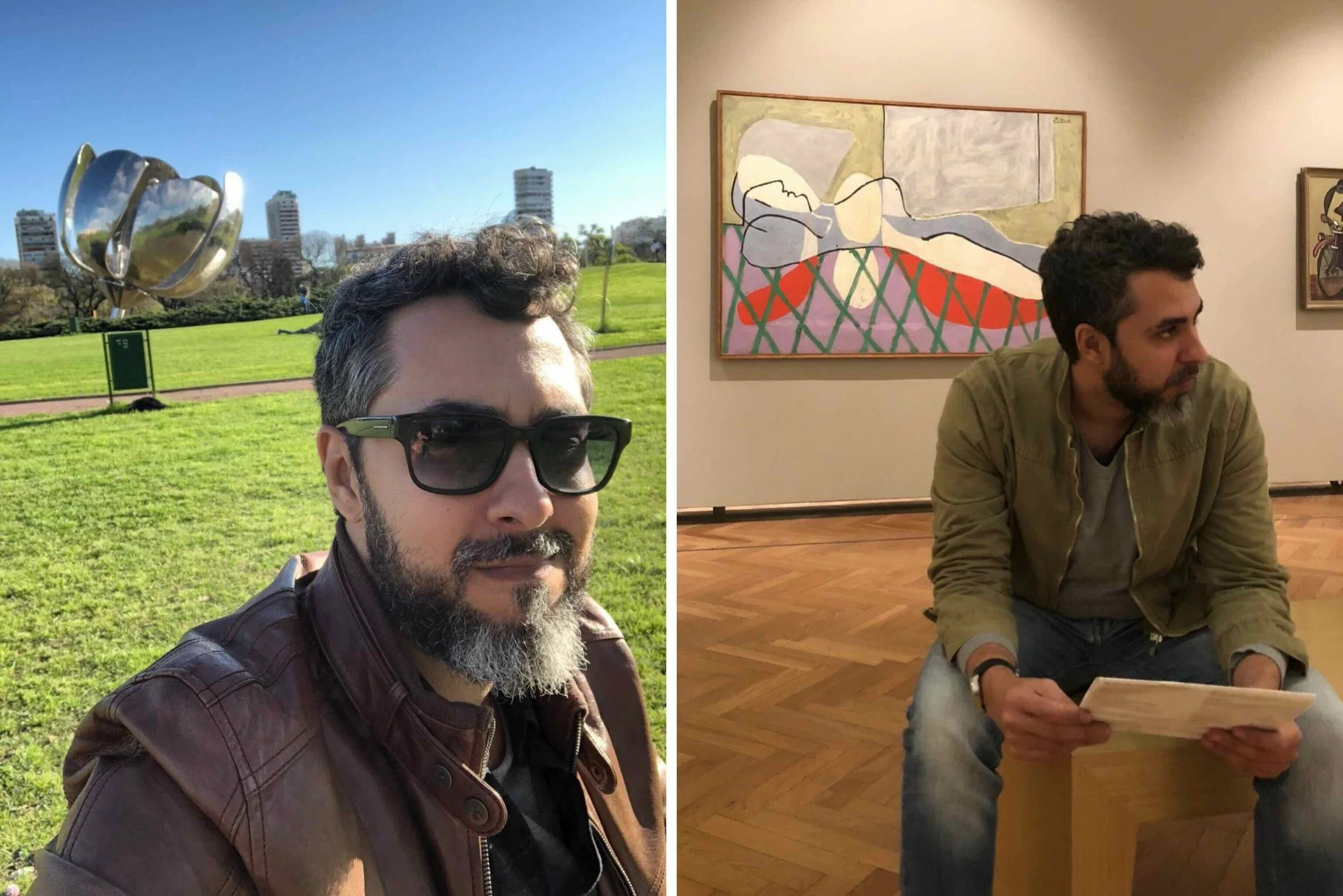 Diego Serra com a escultura Floralis generica, do arquiteto argentino Eduardo Catalano, ao fundo (E) e em frente ao quadro Femme Allongée, de Pablo Picasso, no Museu Nacional de Belas Artes (MNBA) (D), ambos em Buenos Aires, em 2018. As fotos da viagem de 2006 se perderam com o fim do Orkut