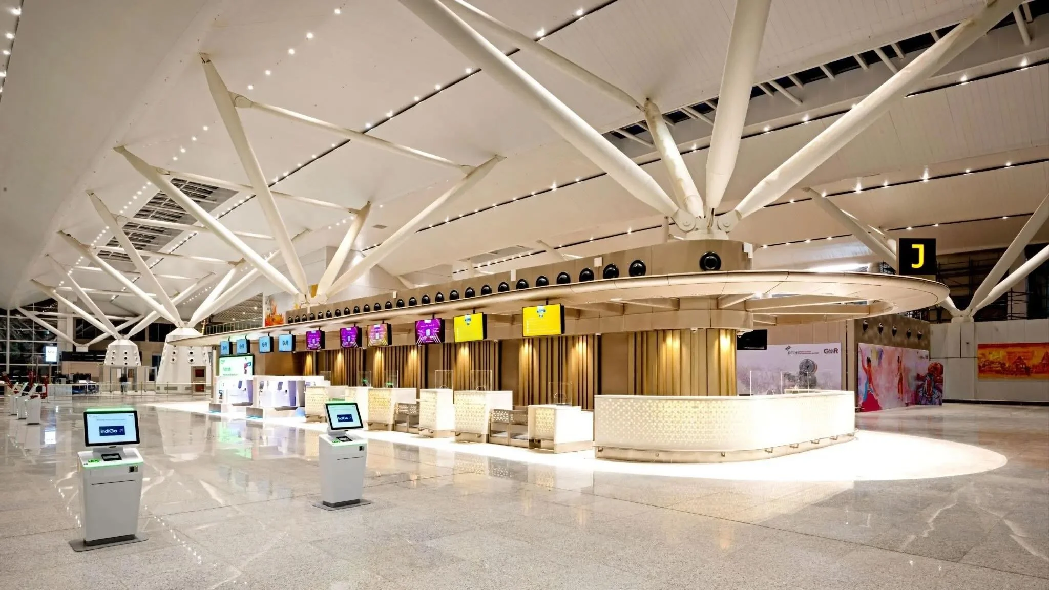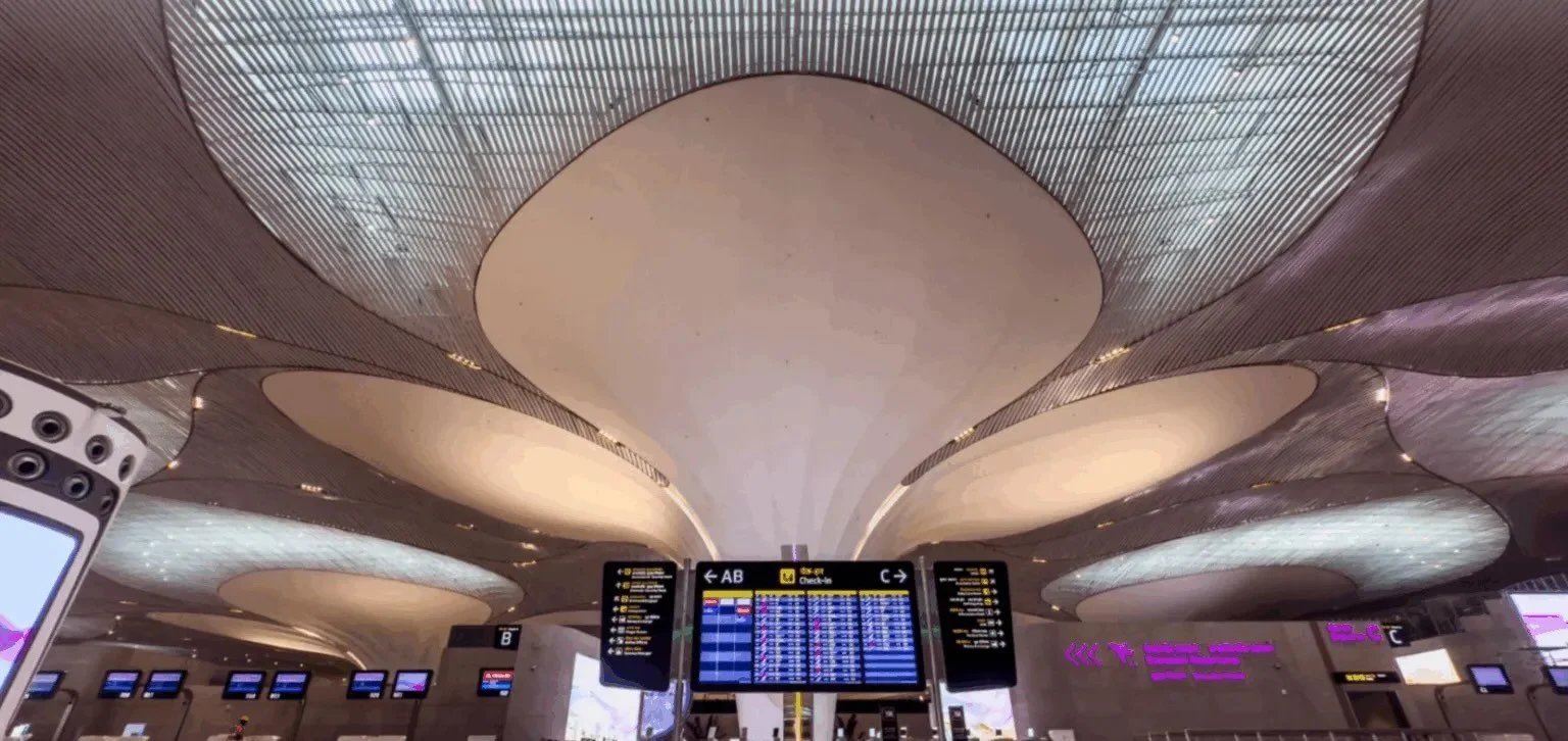 Ainda na Ásia, mas agora sem polêmica — pelo menos até agora. No dia 25 de outubro de 2025 foi inaugurado o novo Terminal 2 do Aeroporto Internacional Indira Gandhi (IGI), em Nova Délhi. Fruto de uma grande reforma (a construção original datava de meados dos anos 1980), ele abriu para os passageiros com instalações aprimoradas e inclui recursos como despacho automático de bagagem (sem interferência de funcionários das companhias e diminuindo as filas), novas pontes de embarque (seis delas contam com tecnologia de acoplamento autômato, o que promete mais eficiência) e um balcão de informações virtual. Neles estão concentradas as operações com voos domésticos — vale lembrar que a Índia é a nação mais populosa do mundo, com quase 1,5 bilhão de pessoas, então o público local é enorme. De início, são 120 voos diários das empresas IndiGo e Air India para diversas destinações no país. Na parte de segurança, o novo terminal conta com sistemas avançados de inspeção de bagagem por raios-X Kritiscan Dual-View, tecnologia desenvolvida na Índia que fornece aos operadores duas perspectivas dimensionais do mesmo item, o que melhora significativamente a capacidade de identificar ameaças ocultas e reduz a necessidade de reposicionar ou reescanear a bagagem, aumentando a eficiência operacional. O terminal conta ainda com mais informações para passageiros, pois apresenta um novo Sistema de Exibição de Informações de Voo (FIDS) e balcões de informações virtuais para atualizações em tempo real. Eu particularmente achei lindas as representações das mudras, posturas das mãos do yoga (ver foto).