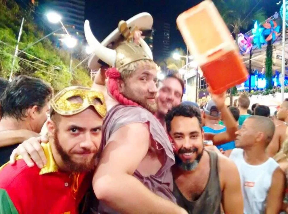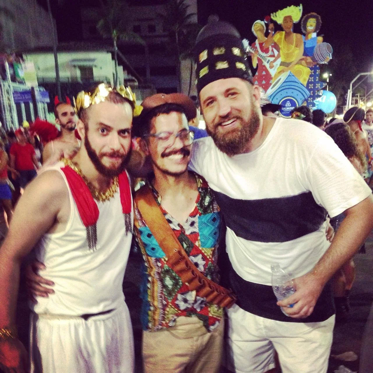 Rafael, Pedro e eu em 2016 (minha fantasia era de Farol da Barra, não de bispo)