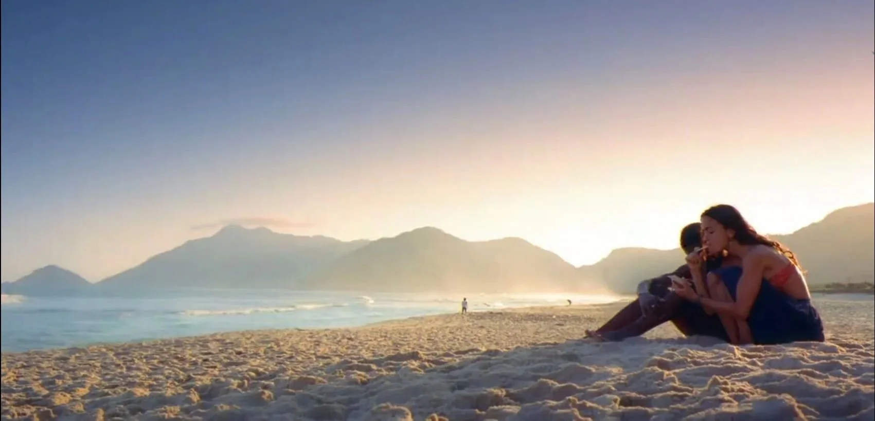 O Rio de Janeiro idílico em uma praia deserta, provavelmente na zona Oeste da cidade, em contraposição ao caos da favela