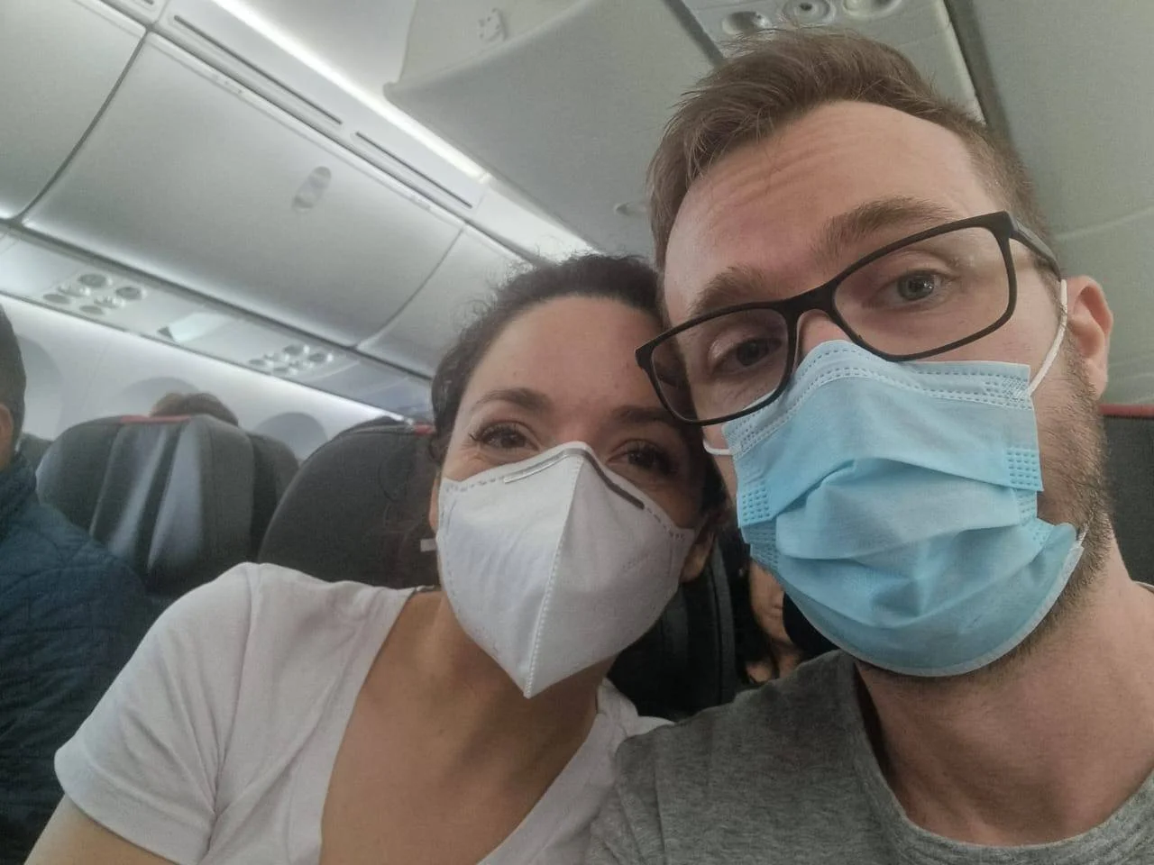 Maiara com marido, no voo Nova York – Tóquio, em março de 2025